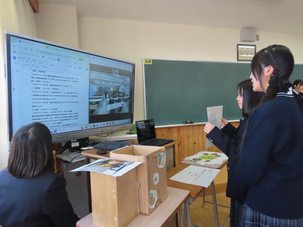 続いて行った学校紹介では、本校の学科・類型の特色、生徒会活動やボランティア活動、学校行事について、生徒自身の言葉で説明し、多くの生徒がリーダーとして学校を引っ張る機会があることなどを伝えました。さらに、地域の福祉施設や子ども食堂、地域のイベントなどで日常的にボランティアに取り組んでいることや、「全員主役の学校」という本校の姿を能登高等学校の皆様に届けました。