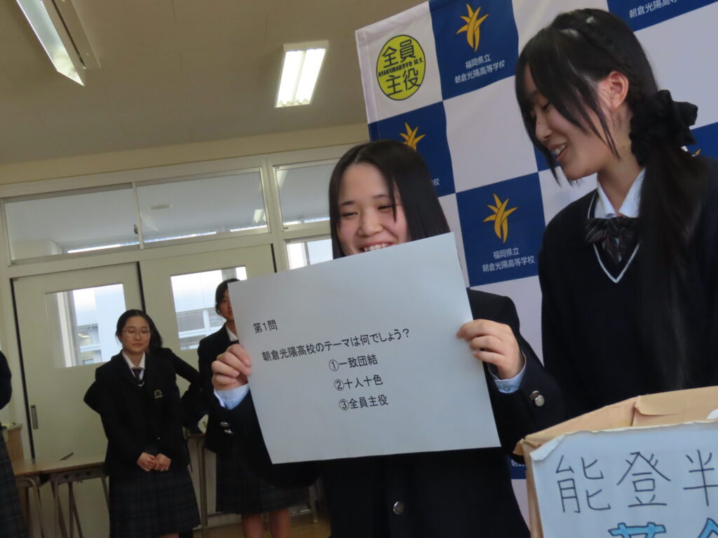 能登高等学校側からも生徒代表の挨拶があり、被災地の現状や日々の学校生活の様子、そして支援への感謝の気持ちが語られ、続いて行われた生徒同士の交流では、本校の「学校クイズ」などを通して、生徒同士の交流を楽しみました。