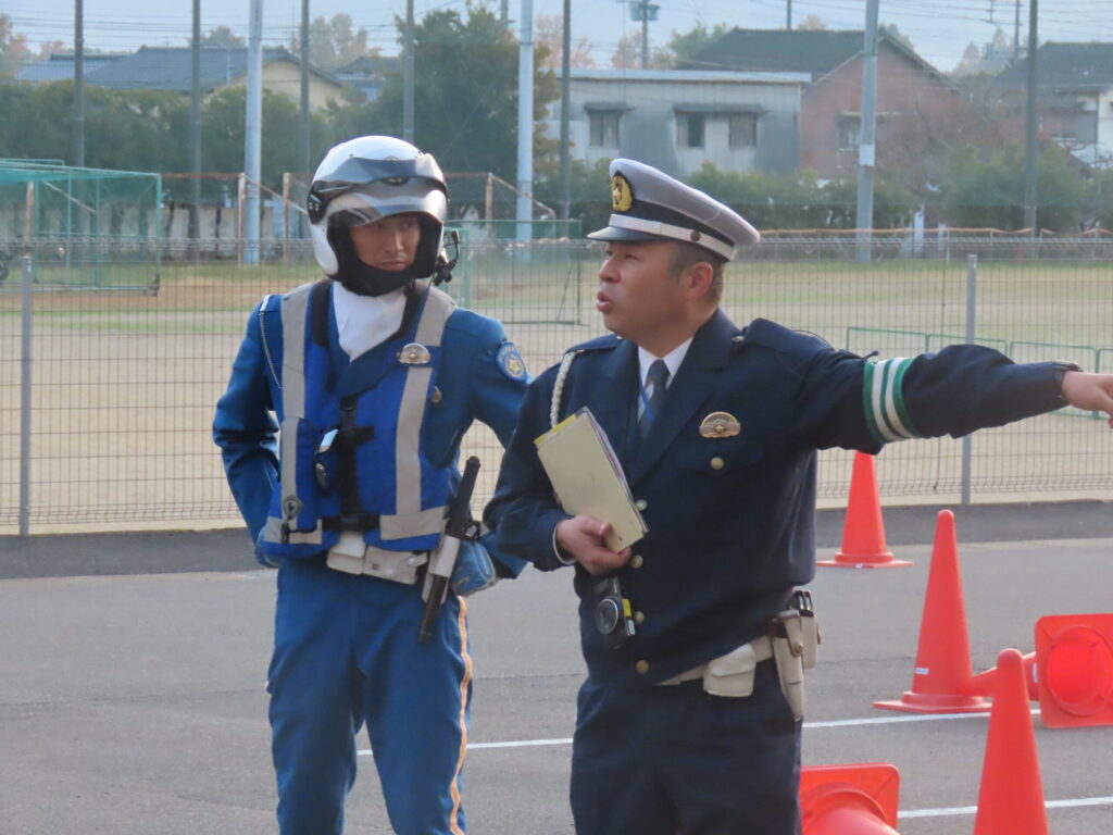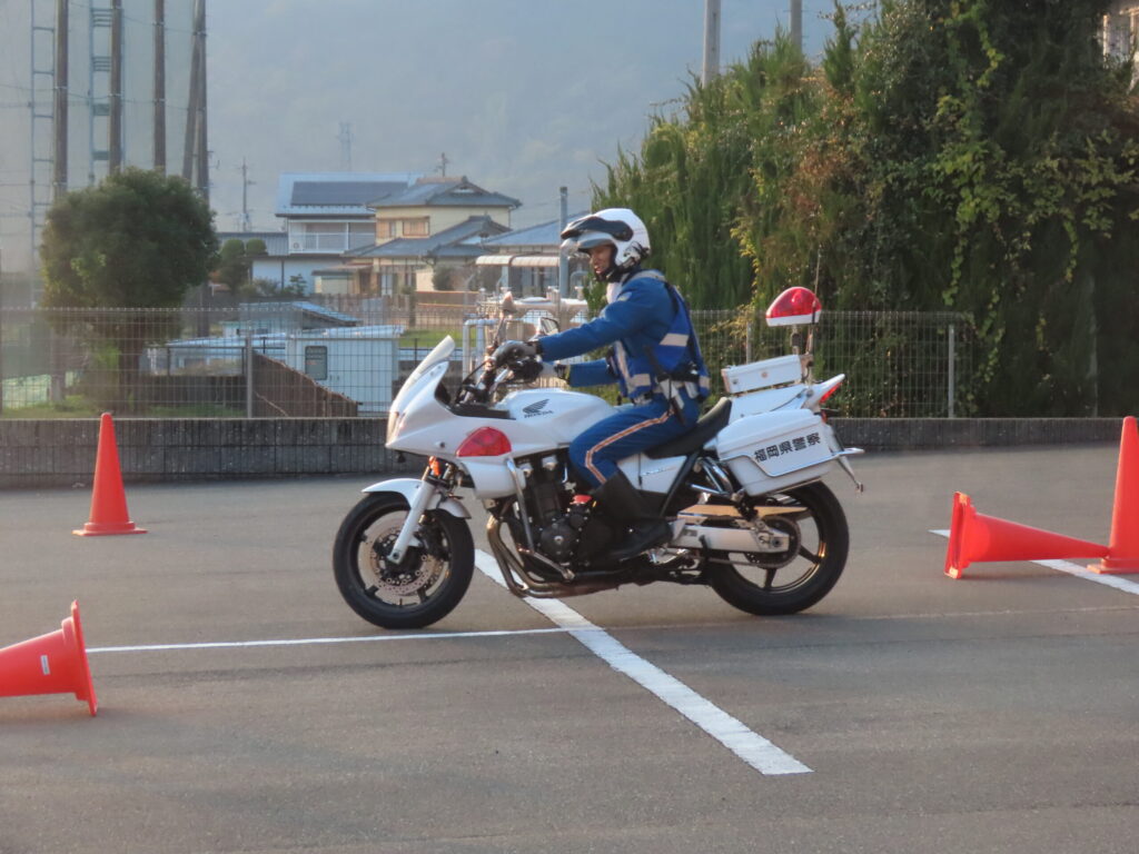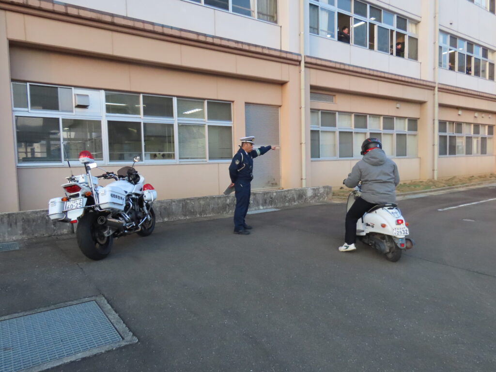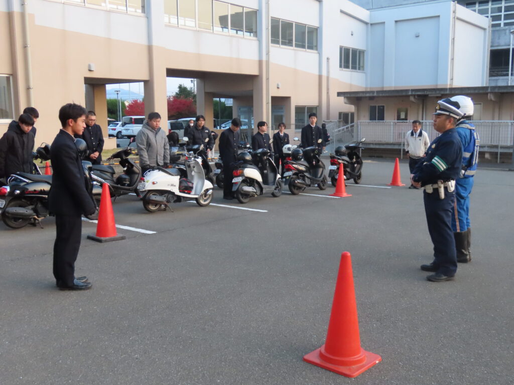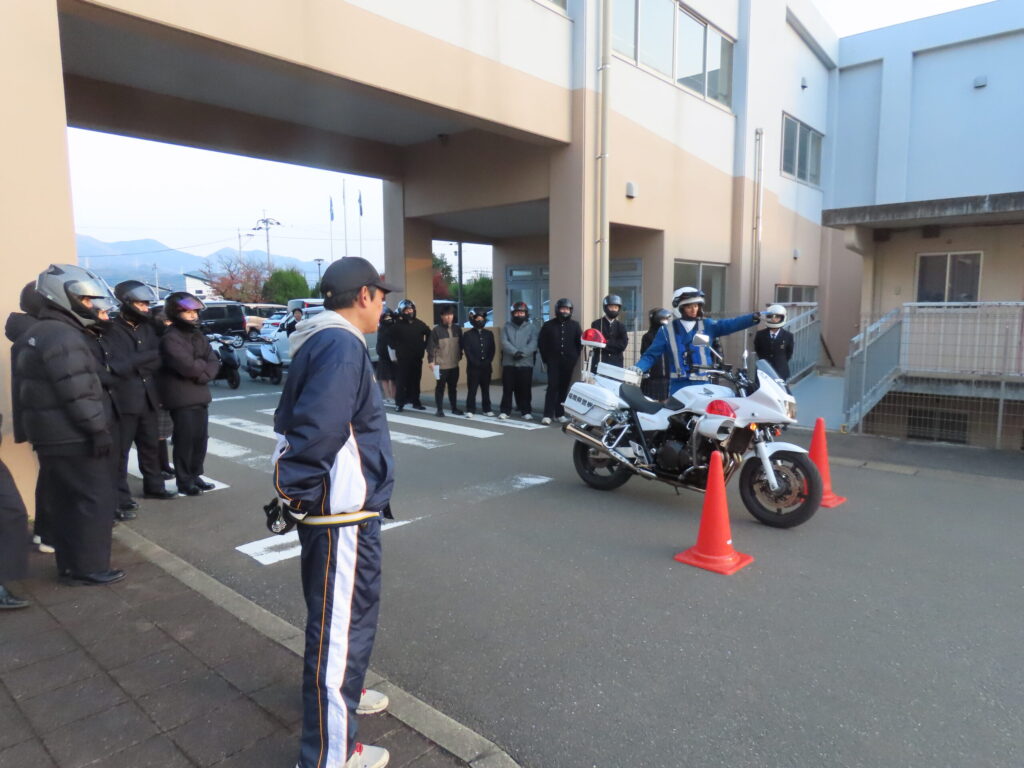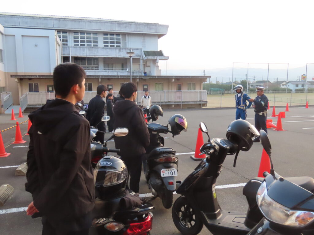 当日は朝倉警察署交通課より2名の警察官の方に来校いただき、本校の駐車場で実技指導を行いました。実際の交通場面を想定した注意点の説明に加え、白バイによる迫力ある実演も行われ、生徒たちは真剣な表情で見入っていました。普段は間近で見ることのない白バイの動きに、多くの生徒が関心を寄せていました。