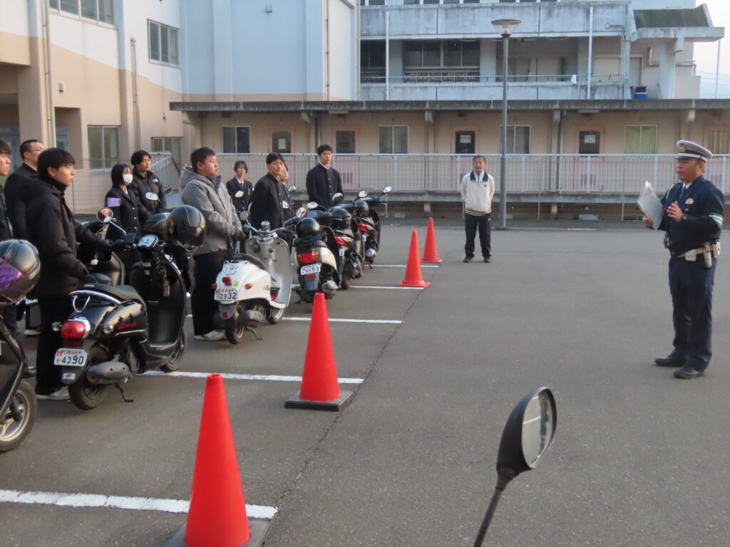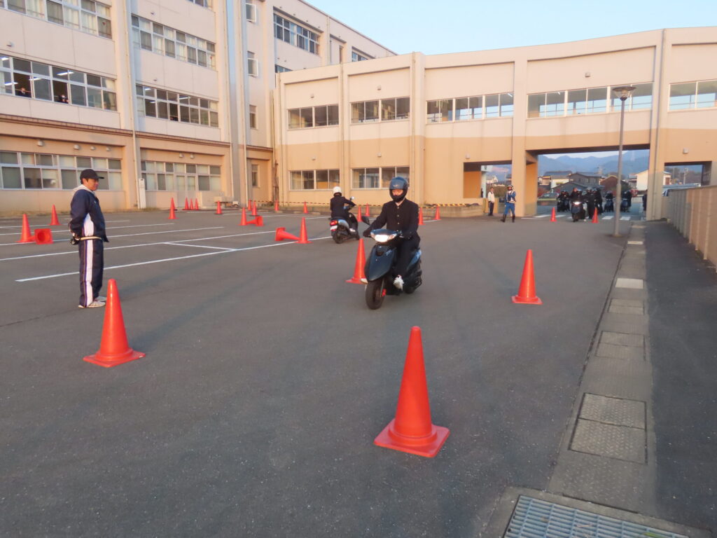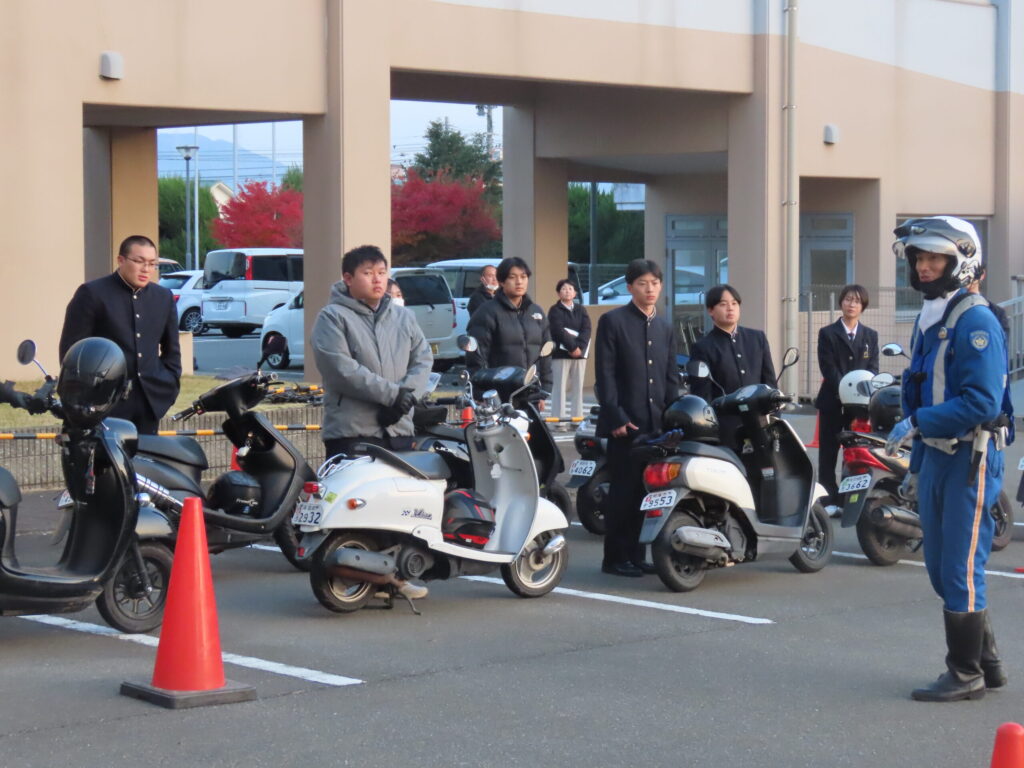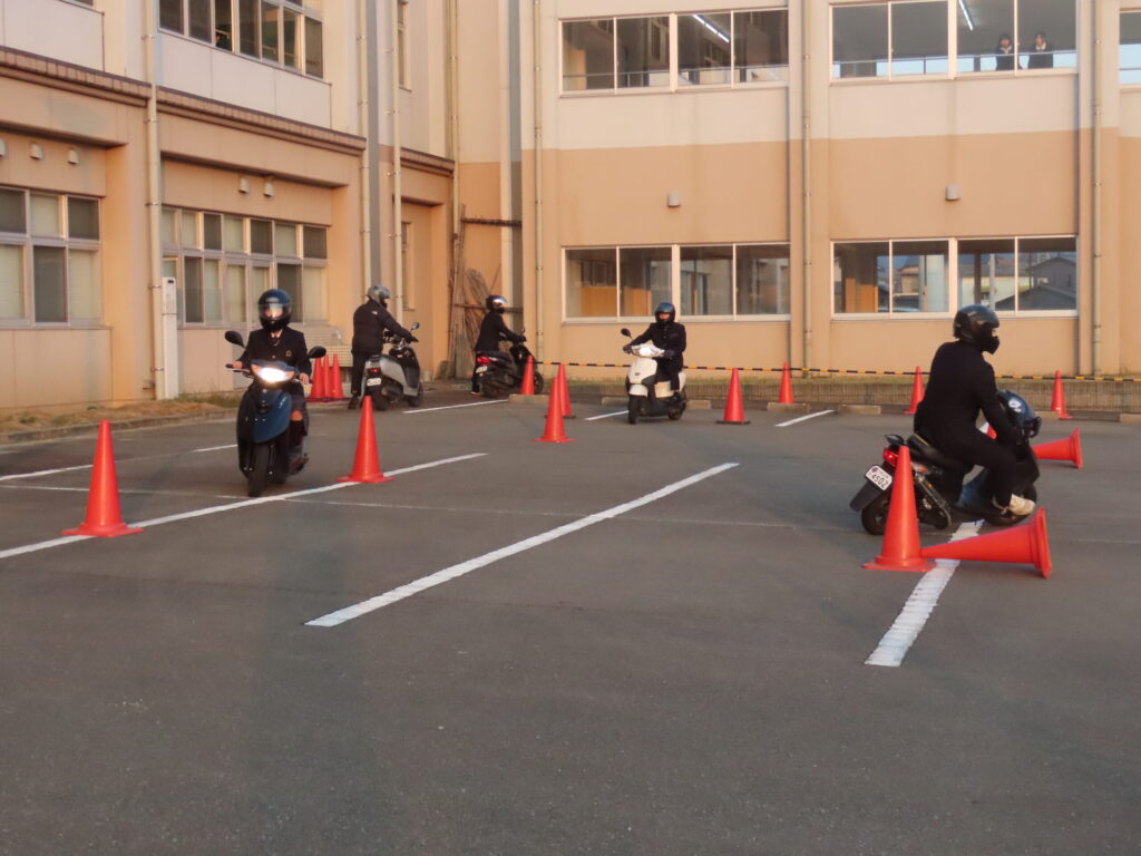 令和7年11月26日(水)、原付バイクで通学する生徒を対象に「原付バイク実技講習会」を実施しました。本講習会は、交通安全への意識を高め、交通法規の遵守や交通マナーの徹底を図ることを目的として毎年行っているものです。