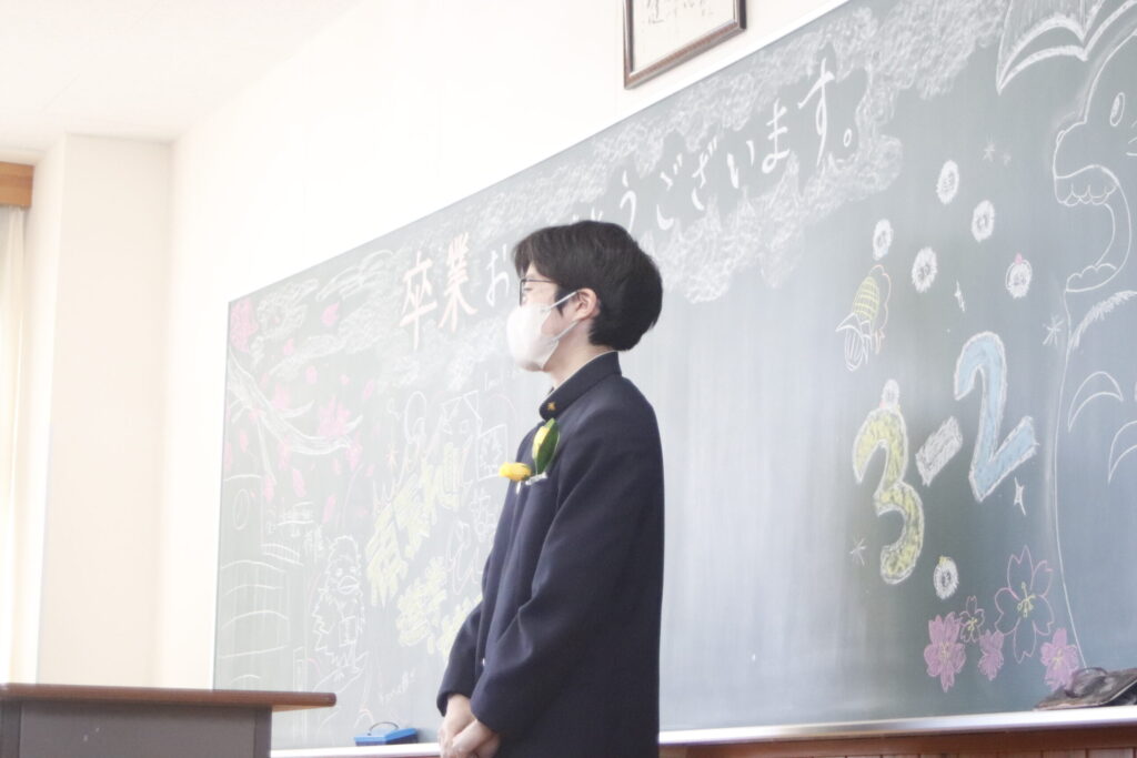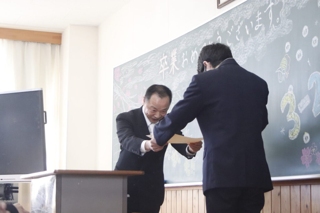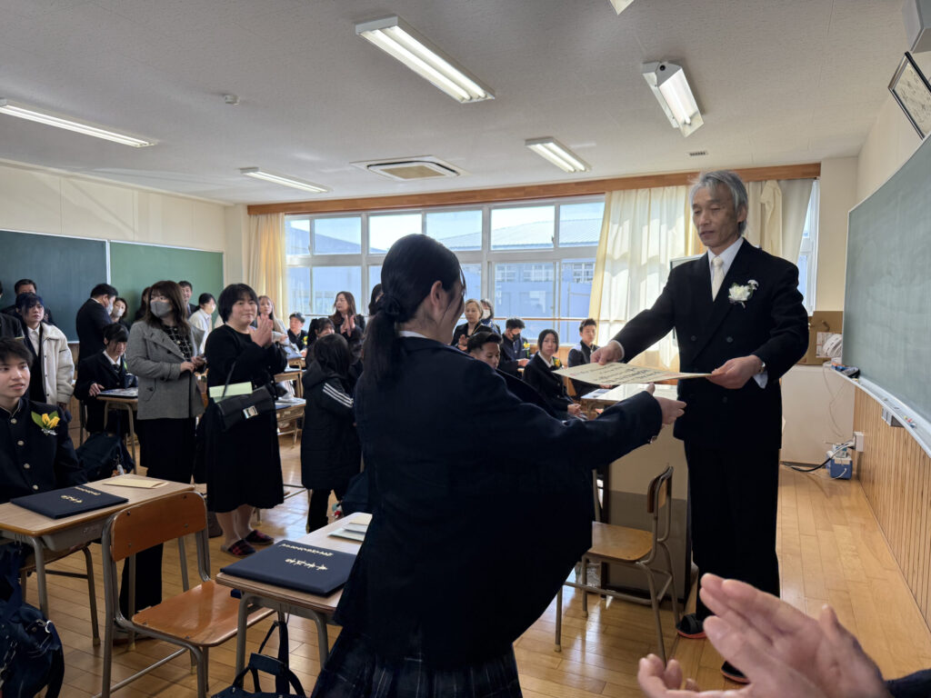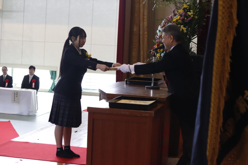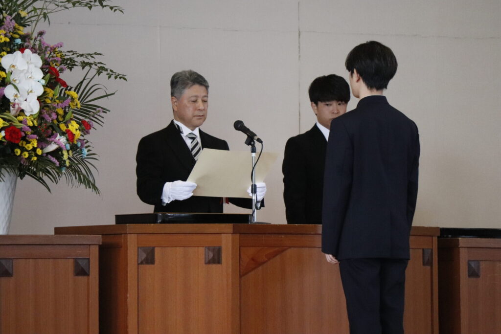 卒業証書授与では、担任の呼名に一人ひとりが力強く返事し、校長より卒業証書が授与されました。その姿から3年間の成長と自信がうかがえました。