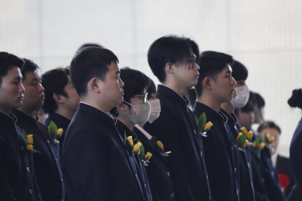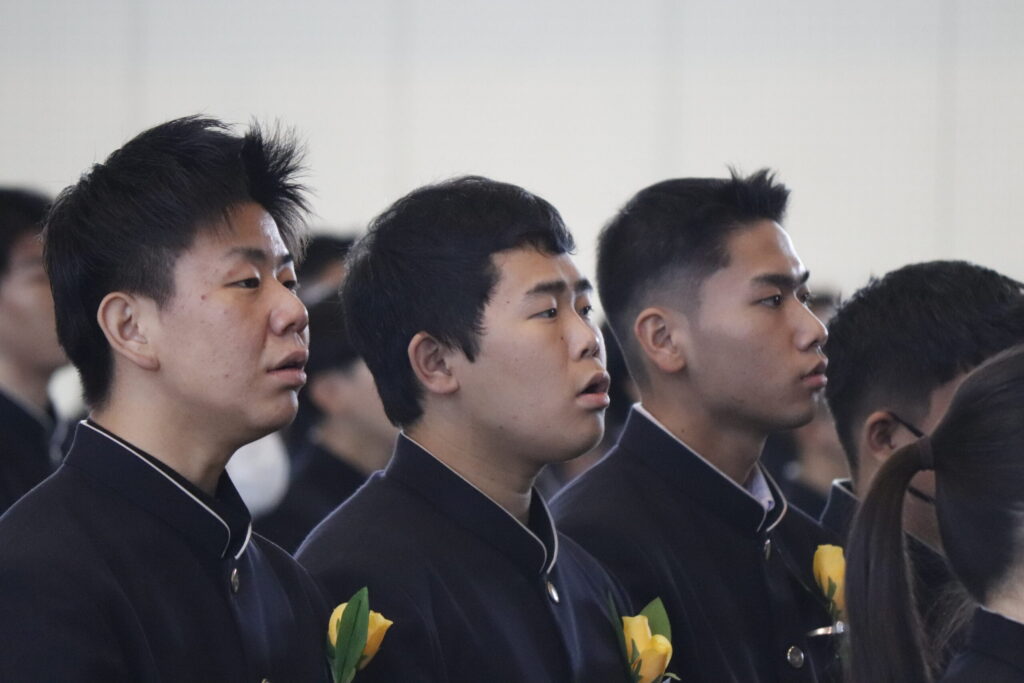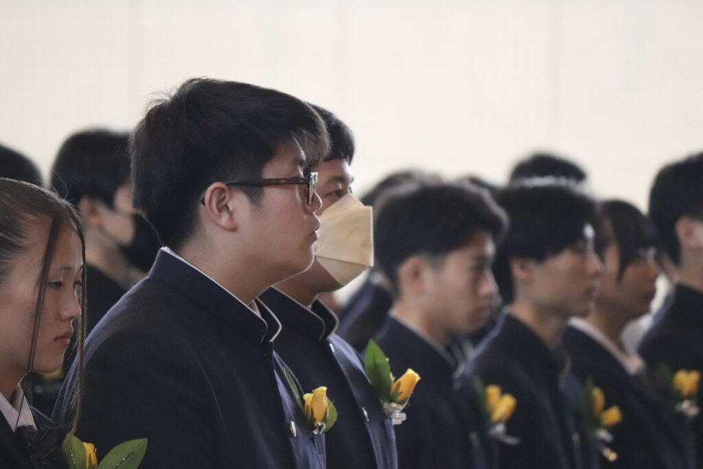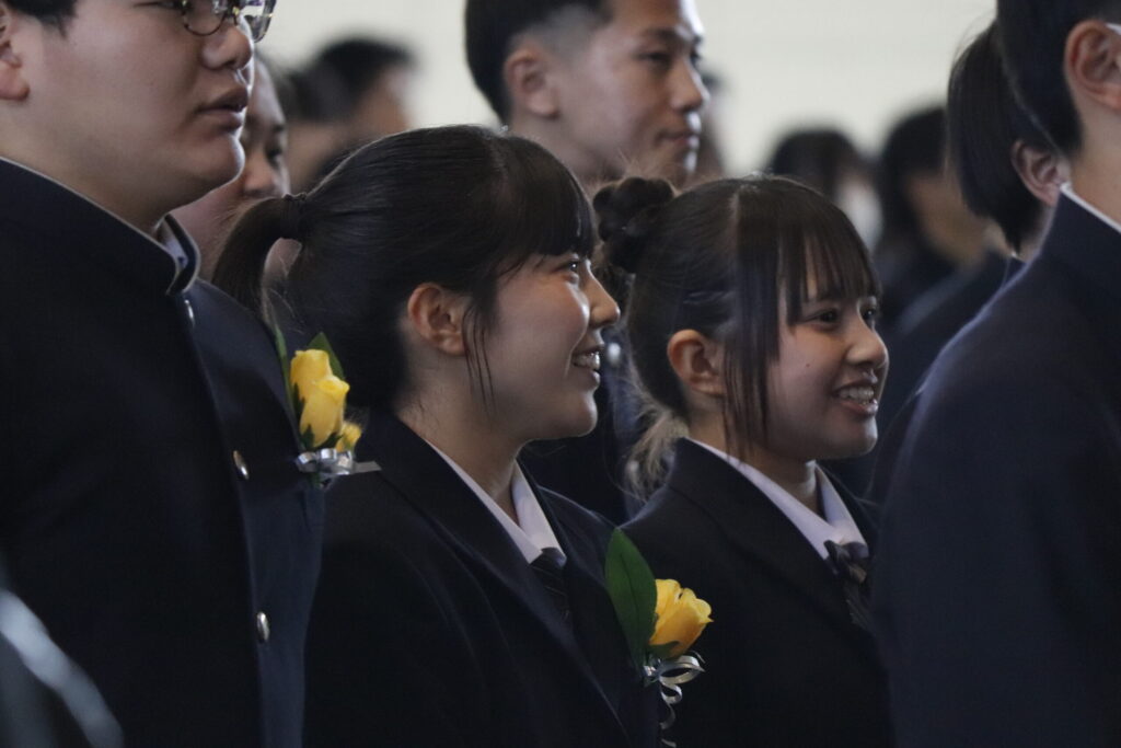 校長式辞では、これまでの努力を称えるとともに、「変化の時代においても、自ら考え、挑戦し続けることの大切さ」について激励の言葉が贈られました。在校生送辞では、先輩方への感謝と尊敬の思いが述べられ、卒業生答辞では、家族や仲間、教職員への感謝の気持ちとともに、高校生活の思い出が語られました。最後に力強く校歌斉唱し、次のステージへと歩みを進めました。