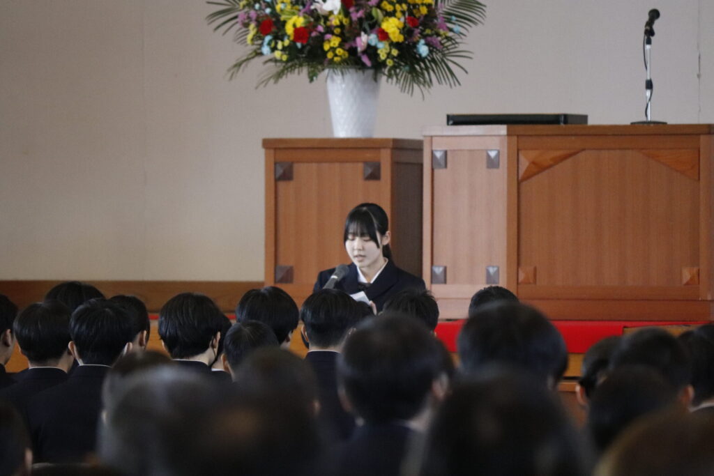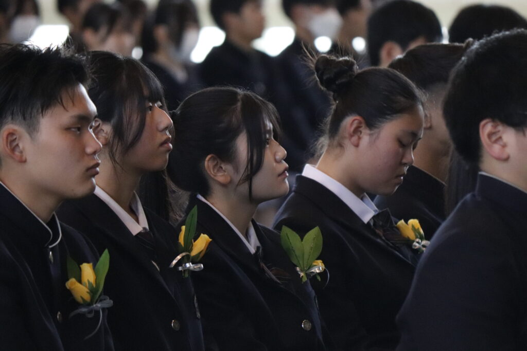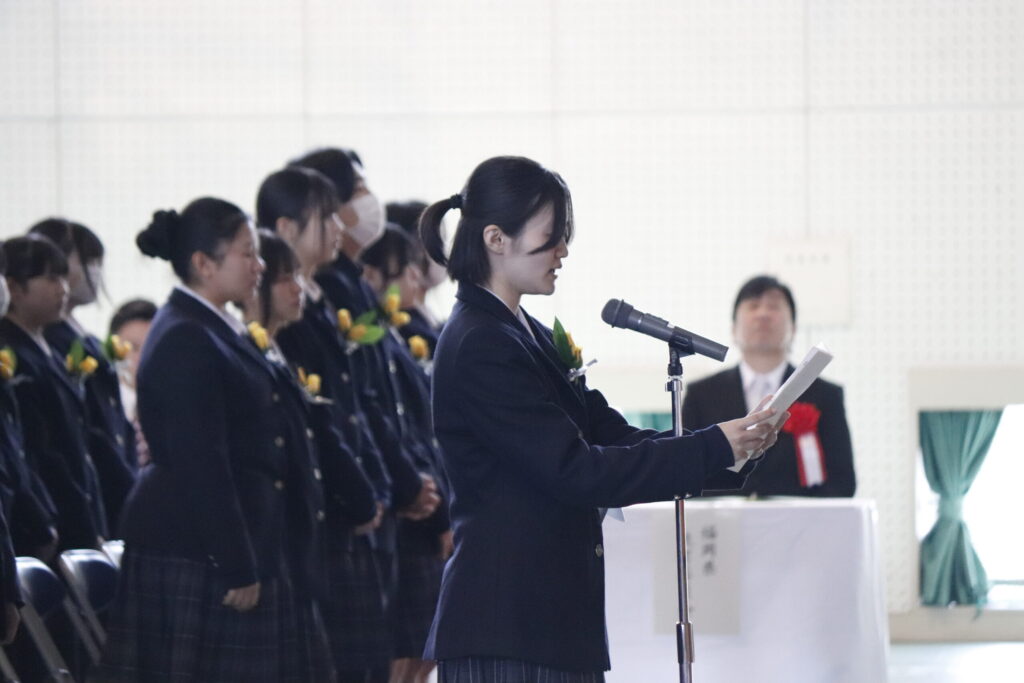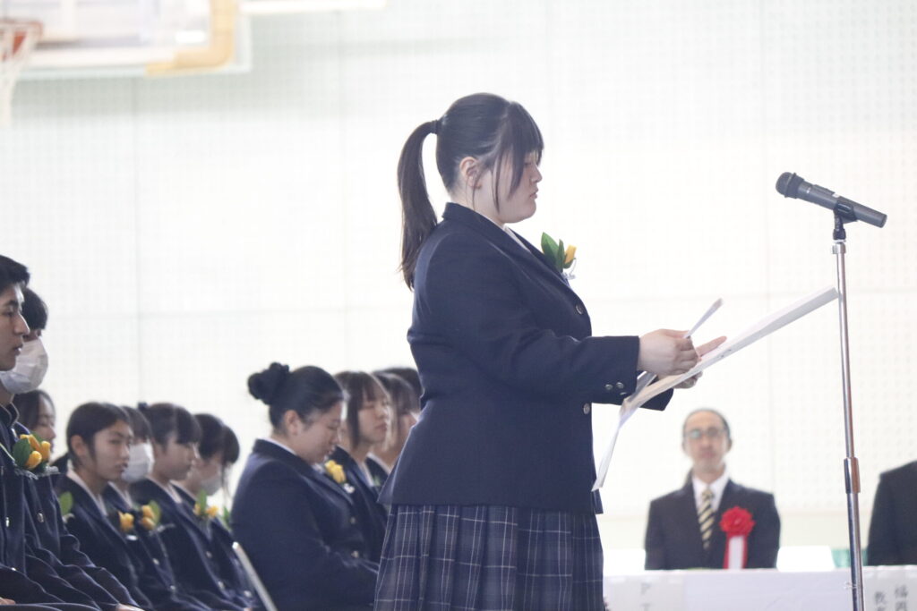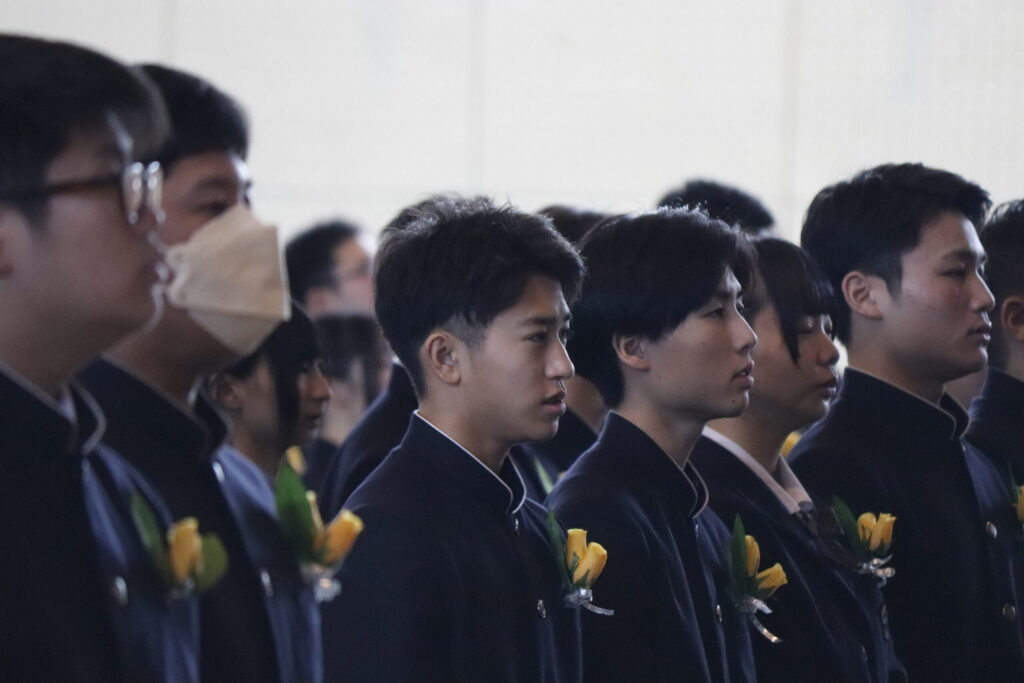 校長式辞では、これまでの努力を称えるとともに、「変化の時代においても、自ら考え、挑戦し続けることの大切さ」について激励の言葉が贈られました。在校生送辞では、先輩方への感謝と尊敬の思いが述べられ、卒業生答辞では、家族や仲間、教職員への感謝の気持ちとともに、高校生活の思い出が語られました。最後に力強く校歌斉唱し、次のステージへと歩みを進めました。