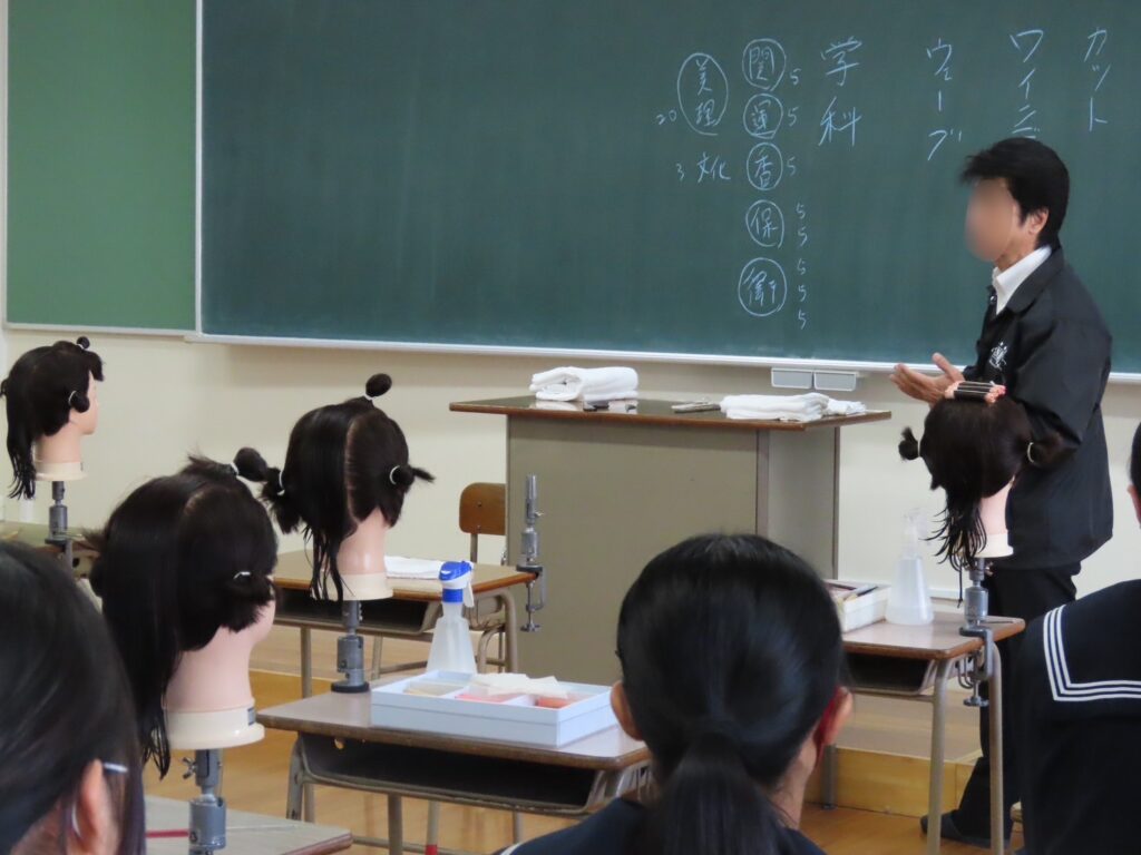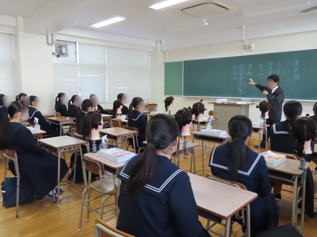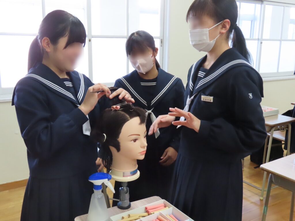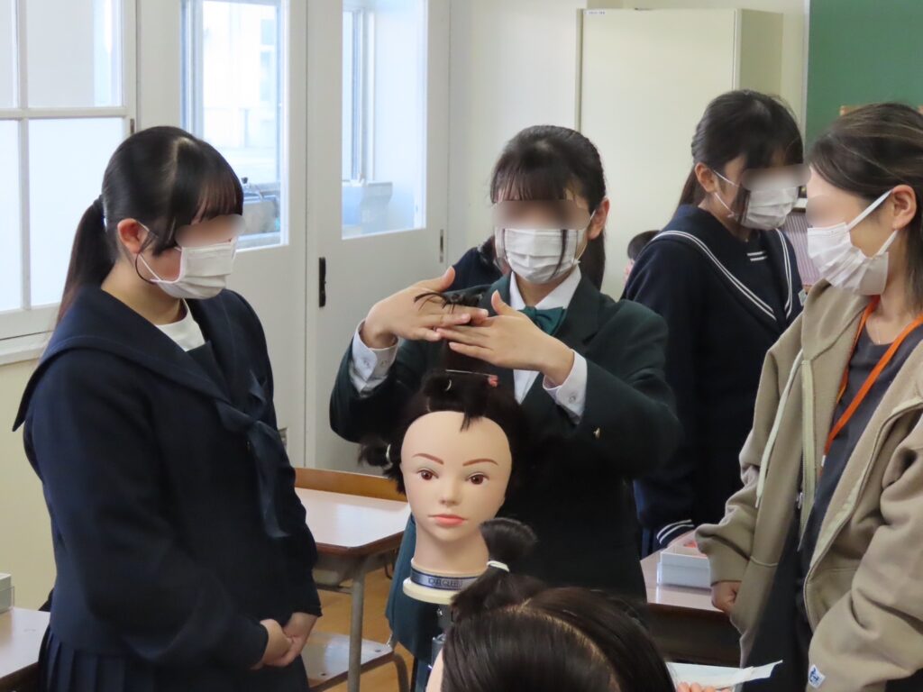 人形を使ったヘアアレンジや基本技術の体験を行い、美容の世界に触れることができる内容となりました。美容講師の専門的な指導に中学生も興味津々でした。
