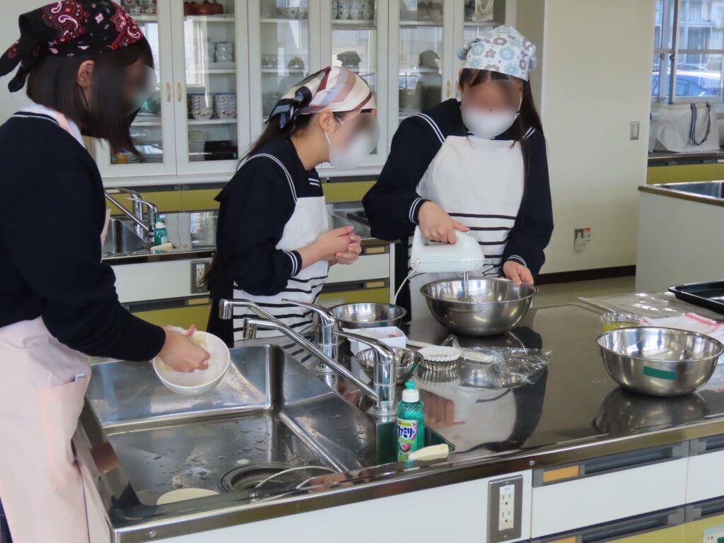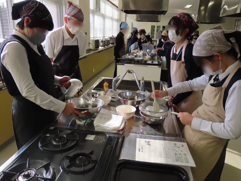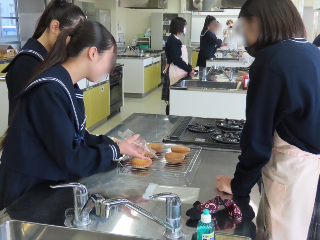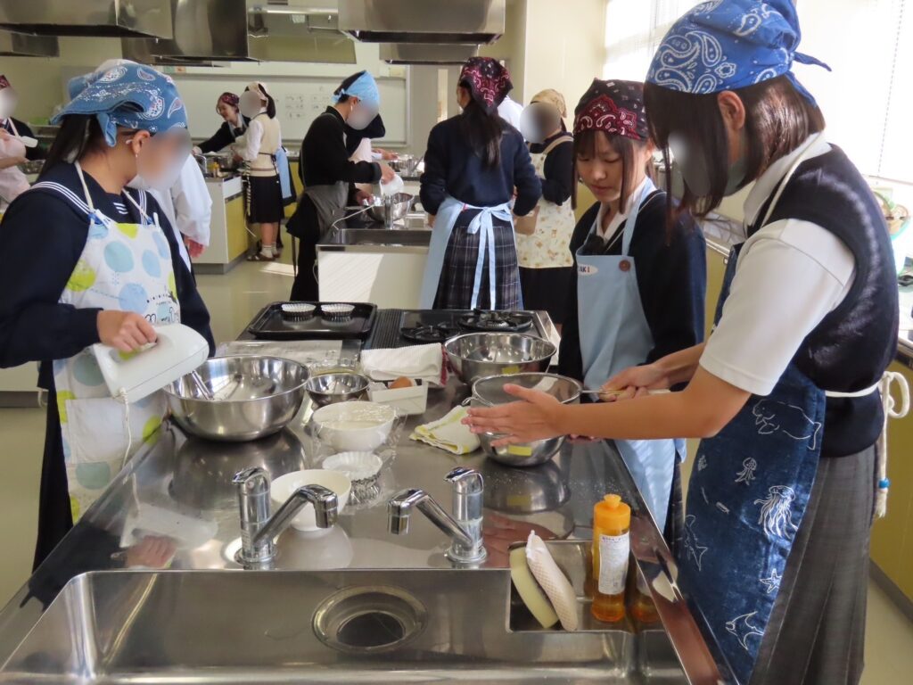 生地から焼き上げまでの工程に取り組み、ふくらみ具合や焼き色の違いに関心を寄せる姿が多く見られました。できあがったマドレーヌの甘い香りが調理室に広がっていました。