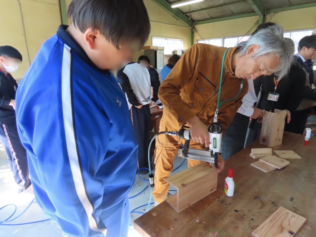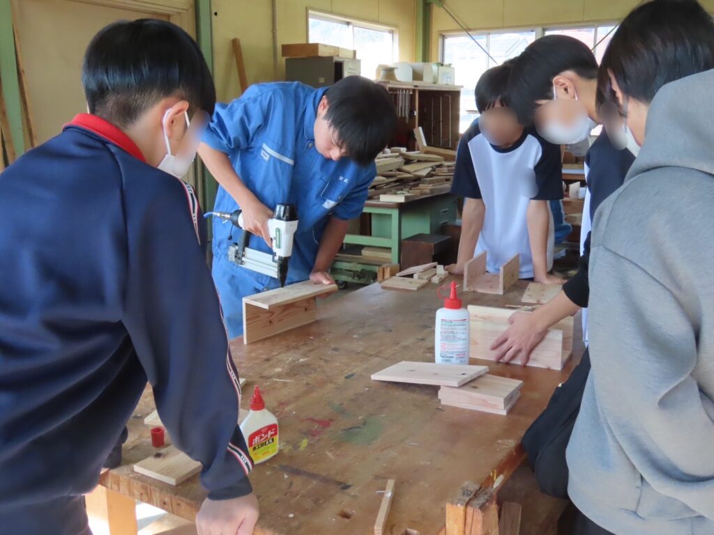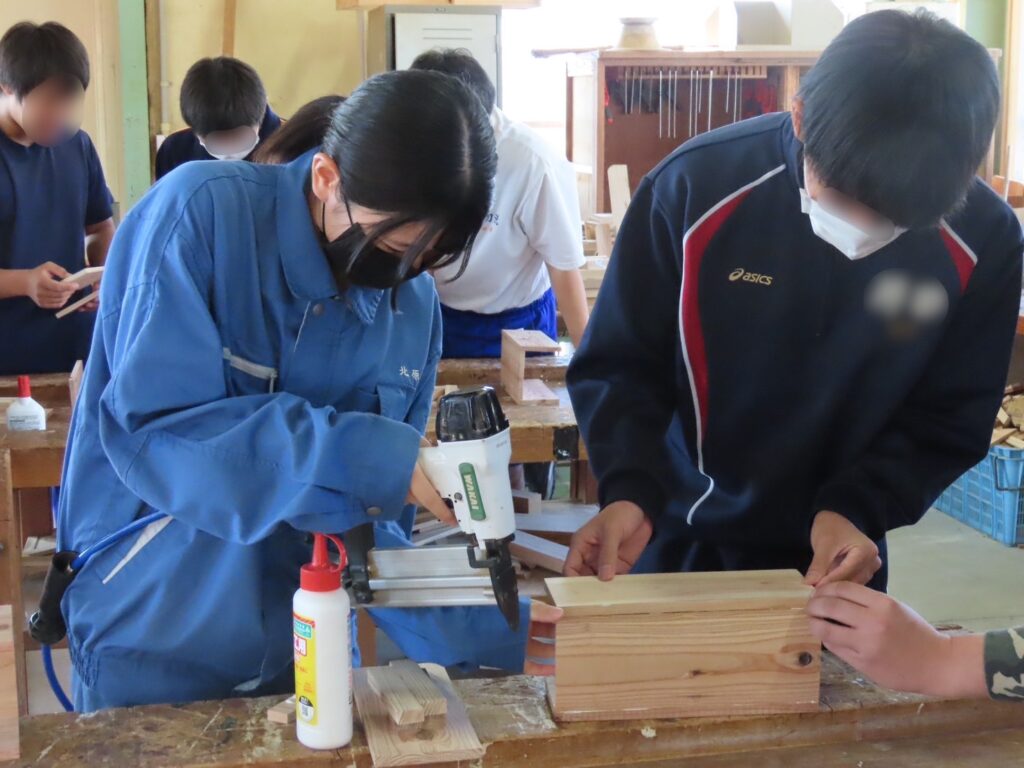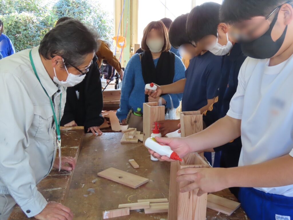 木材の切削や組み立てなど、本格的な木工技術を体験しました。生徒・教員が丁寧にサポートしながら、中学生が自分だけの小物入れを完成させました。