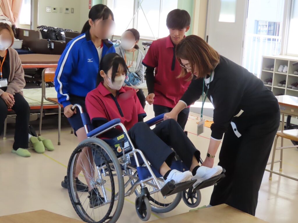 介護技術の基礎を身につける講座で、実際に車いすを操作しながら、福祉の学びの中で大切にしている「相手に寄り添う姿勢」を実感していただきました。