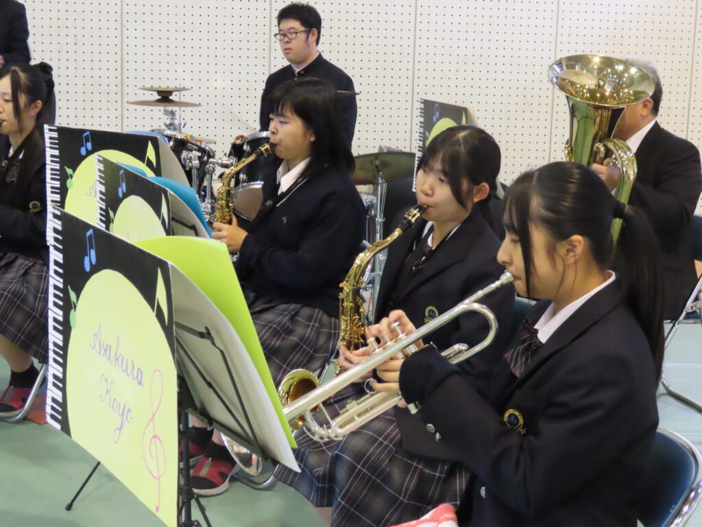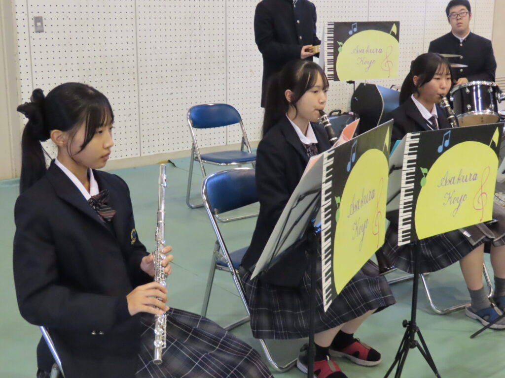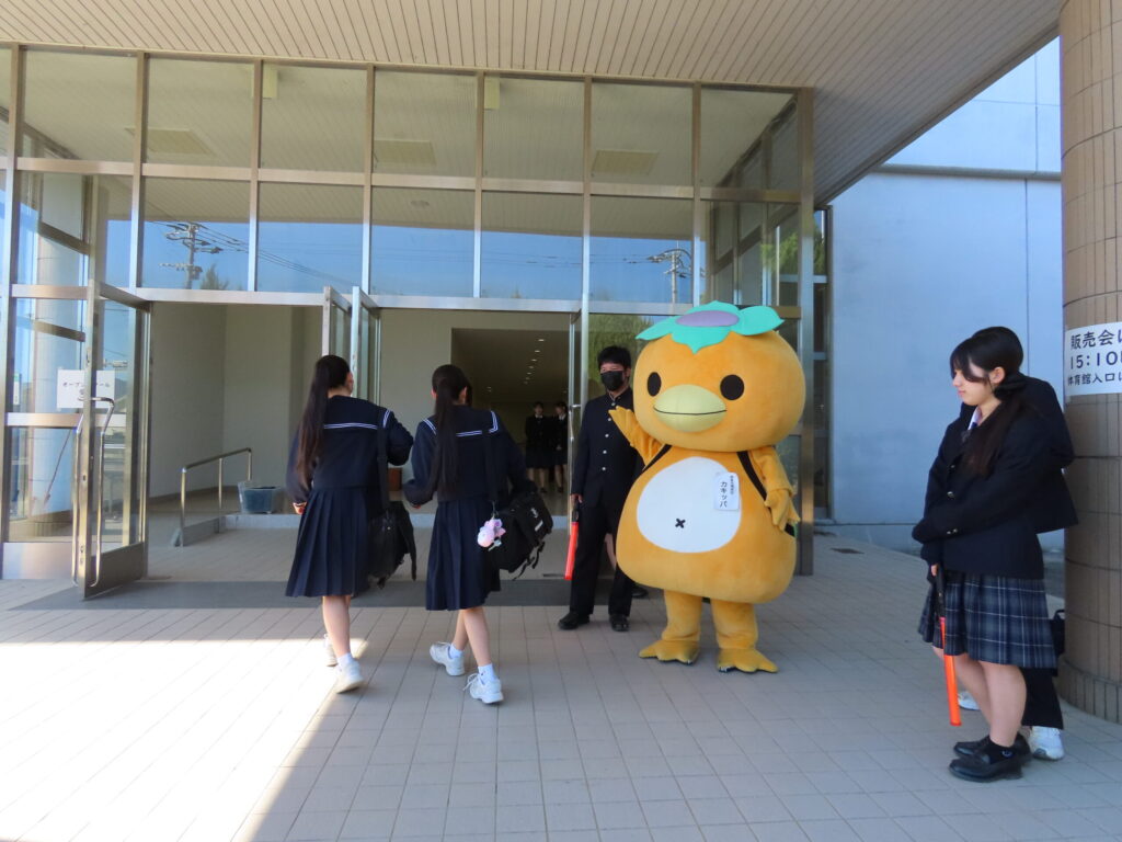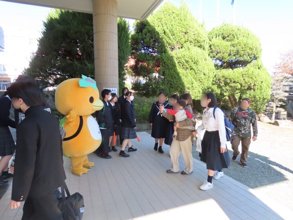 午後の部では、本校オリジナルのキャラクター「カキッパ」が正面玄関で出迎えました。中学生は驚いた様子や触れ合う姿も見られました。体育館にて吹奏楽部による歓迎演奏で幕を開け、開講式では校長挨拶の後、生徒会生徒による学校紹介が行われました。本校の特色と学びが紹介され、初めて本校を訪れる中学生にとって、朝倉光陽高校を詳しく知ることができました。