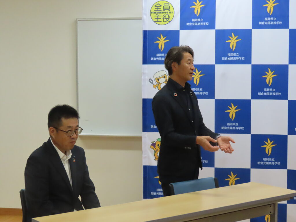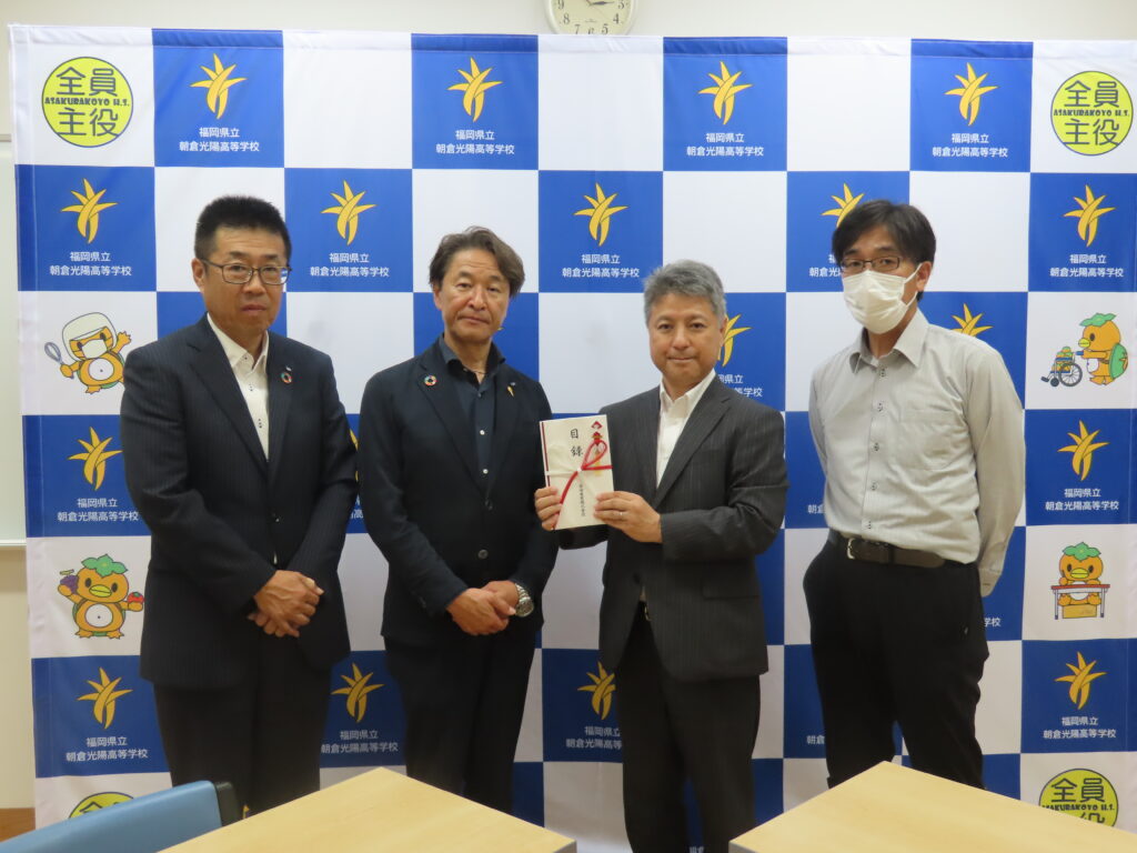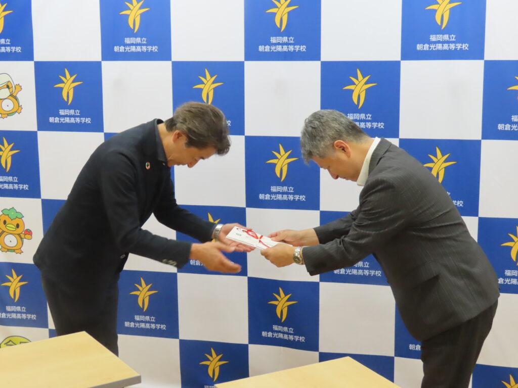 株式会社岩田産業ホールディングスは、食品産業を中心に多岐にわたる事業を展開し、SDGsへの取組として農業支援事業をされています。その一環として農業へ従事している本校にご支援をいただくことになりました。そのため、令和7年10月16日(木)に目録の贈呈式を行い、 岩田産業株式會社より代表取締役兼社長執行役員の 岩田章正 様と、株式会社岩田産業ホールディングスより執行役員兼業務統括本部長の 原口康紀 様 より寄付金を贈呈頂きました。今後の本校における農業教育の充実のために大切に使わせていただきます。ありがとうございました。