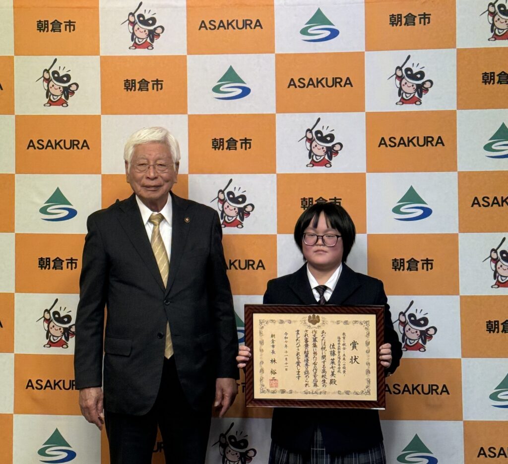 表彰式では、朝倉市の林市長から直接表彰を受け、「これからも夢に向かって頑張ってください」